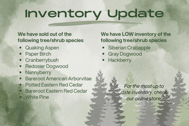 Prices and varieties available are indicated on the online store or the paper order form. Payment must accompany your order. Plan to pick up your trees/shrubs toward the end of April. You will receive a postcard about two weeks before delivery with the specific pick up information. You may also want to take advantage of tree marking flags or tree protection tubes available on the order form at nominal cost.